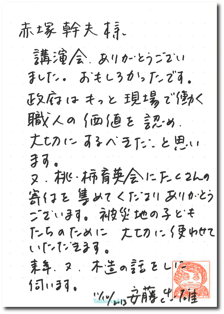 だから、安藤忠雄さんの講話の終わりを皆惜しみ、拍手が止まないのだと思います。