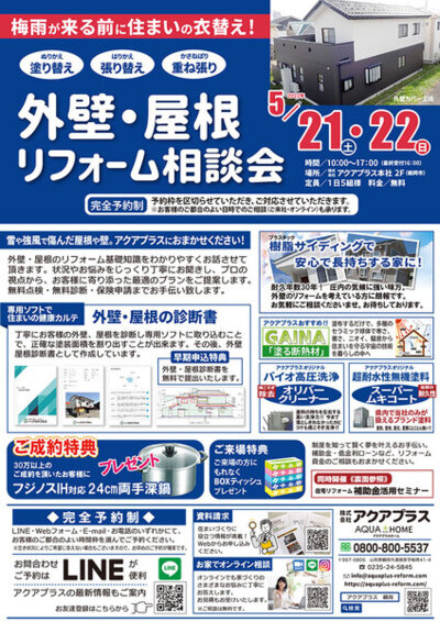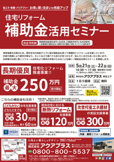 イベント イベントその他のイベント [ 山形県鶴岡市 ] 夢ハウス見学会 新潟ツアー ご相談 アクアプラススタッフと一緒に、夢ハウスの素晴らしい住まいづくりを体感する新潟ツアーです。 お客様...[ 続きを読む ] 開催時間 ご相談 定員なし 参加費用 ご相談 会場名株式会社アクアプラス 集合 開催場所 山形県 鶴岡市 遠賀原字稲荷41-4 イベント各種セミナー [ 山形県鶴岡市 ] 住宅リフォーム補助金活用セミナー 2022年5月21日(土)~22日(日) 省エネ・耐震・バリアフリー お得に賢く住まいの性能アップ 地球温暖化対策のため、既存住宅の性能ア...[ 続きを読む ] 開催時間 10時~17時(最終受付16時) 定員予約枠を区切って対応 参加費用 無料 会場名アクアプラス本社2階 開催場所 山形県 鶴岡市 遠賀原字稲荷41-4