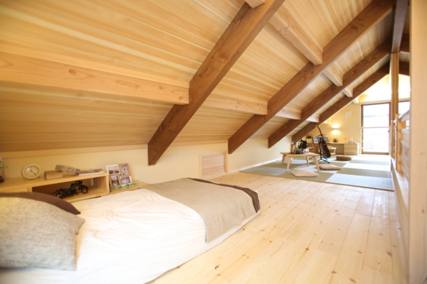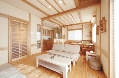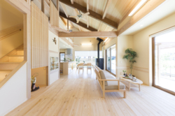 約60坪の自由設計のお住まいです。リビングの吹き抜け、屋根の勾配を活かした空間と柱や梁の構造材を...