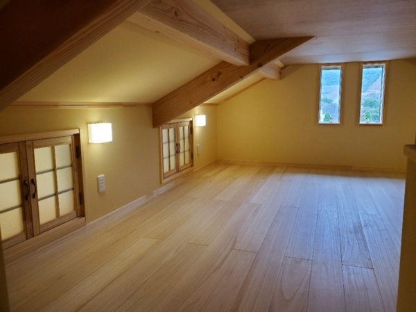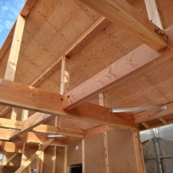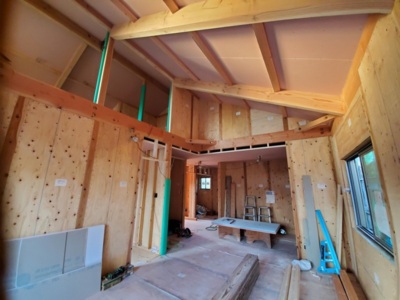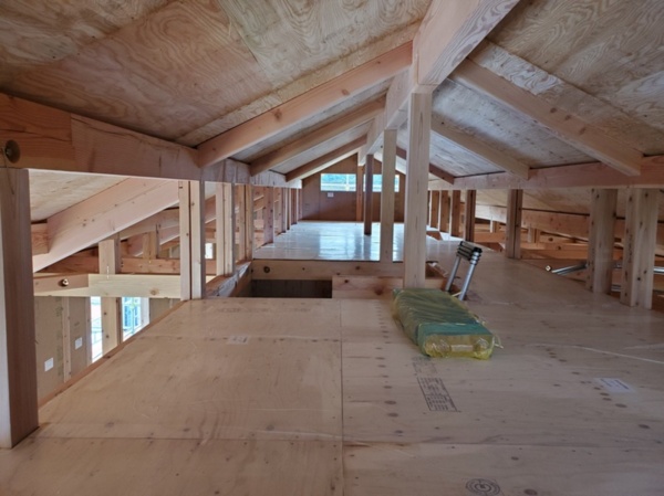 完成した状態では見えなくなってしまう壁・床・屋根の断熱材。天然無垢材の柱・土台・梁。