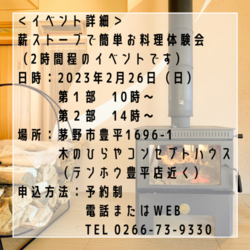 イベント 見学会完成見学会 [ 長野県茅野市 ] 茅野市湖東 完成見学会 2024年4月20日~5月6日 お施主様のご厚意により完成見学会を実施いたします!この機会にぜひ本物の無垢の家「木のひらや」を内...[ 続きを読む ] 開催時間 入場時間 9時半~18時 定員1組5名様 参加費用 無料 会場名茅野市湖東木のひらや 開催場所 茅野市湖東(花蒔公園近く)お申込み後に位置情報をご連絡いたします。 見学会完成見学会 [ 長野県茅野市 ] ◆完成見学会◆ 2023年11月28日〜12月3日 <木のひらや住宅見学会> コンパクトでスタイリッシュな外観からは想像できない驚きの無垢の大空間を...[ 続きを読む ] 開催時間 ①10時~ ②13時~ ③15時半~ ④18時~ 定員4組(1組5人様迄) 参加費用 無料 会場名茅野塚原住宅 開催場所 長野県茅野市塚原 見学会完成見学会 [ 長野県茅野市 ] ◆住宅見学会◆ 2023年11月23日・24日 <木のひらや住宅見学会> 大変好評を頂いております木のひらやをご内覧頂けます。一級建築士による建...[ 続きを読む ] 開催時間 ①10時~ ②13時~ ③15時半~ ④18時~ 定員4組(1組5人) 参加費用 無料 会場名木のひらやコンセプトハウス 開催場所 長野県 茅野市 豊平1696-1 見学会完成見学会 [ 長野県茅野市 ] ◆コンセプトハウス見学会・相談会◆ 2023年10月7日・8日 <木のひらやコンセプトハウス見学会・相談会> 大変好評を頂いております弊社の木のひらやコンセプト...[ 続きを読む ] 開催時間 ①10時~ ②13時~ ③15時半~ ④18時~ 定員4組(1組5人) 参加費用 無料 会場名木のひらやコンセプトハウス 開催場所 長野県茅野市豊平1696-1 見学会完成見学会 [ 長野県茅野市 ] ◆コンセプトハウス見学会・相談会◆ 2023年9月23日・24日 <木のひらやコンセプトハウス見学会・相談会> 大変好評を頂いております弊社の木のひらやコンセプト...[ 続きを読む ] 開催時間 ①10時~ ②13時~ ③15時半~ ④18時~ 定員4組(1組5人) 参加費用 無料 会場名木のひらやコンセプトハウス 開催場所 長野県茅野市豊平1696-1 勉強会薪ストーブ [ 長野県茅野市 ] 薪ストーブで簡単お料理体験会 2023年2月26日(日) 簡単!美味しい!スモークチキンとミニピザを一緒に作ってみませんか?薪ストーブに興味のある方や薪ス...[ 続きを読む ] 開催時間 第1部 10時~12時 第2部 14時~16時 定員1組5名程迄 詳しくはお問い合わせ下さい 参加費用 無料 会場名木のひらやコンセプトハウス 開催場所 長野県 茅野市 豊平1696-1 見学会完成見学会 [ 長野県茅野市 ] 木のひらや完成見学会 2021年8月7日(土)~2021年8月9日(祝) 「木のひらや」コンセプトハウスの完成見学会[ 続きを読む ] 開催時間 受付:午前9時~午後16時迄 定員1日3組様 参加費用 無料 会場名木のひらやコンセプトハウス 開催場所 長野県茅野市豊平1676 隣接地