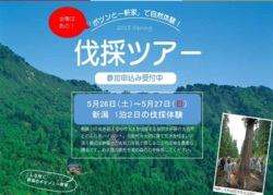 | 開催時間 | ○1日目 9:00出発、12:00秋田まるごと市場(昼食)、16:30新潟瀬波温泉 ○2日目 7:50新潟瀬波温泉出発、8:30夢ハウス本社、10:30伐採現場到着、11:50夢山荘(昼食)、13:30下山、14:45帰路、21:15五所川原市内着(予定) |