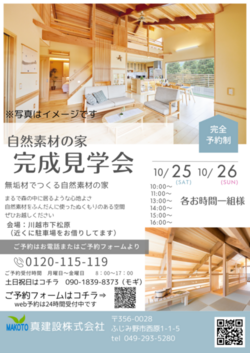 この度お施主さまのご厚意により、川越市下松原にて【自然素材の家 完成見学会】を開催させていただく事となりました。