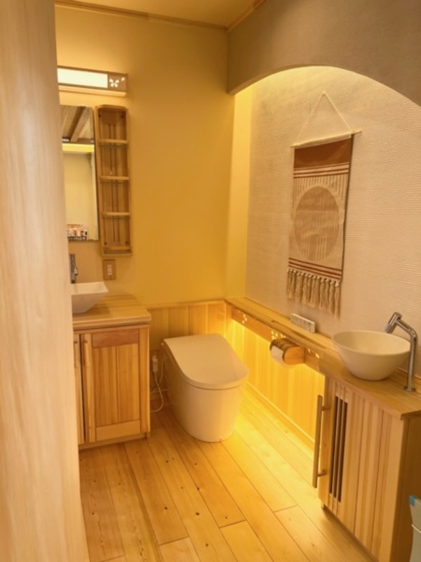 木の香り、ぬくもりを感じます。織り上げ天井のある開放感あるキッチン、珪藻土入りクロス、漆喰で塗られたトイレスペースなど、無垢材、自然素材を体感できます。お時間のある方には、住宅説明も併せて行わせていただきます。