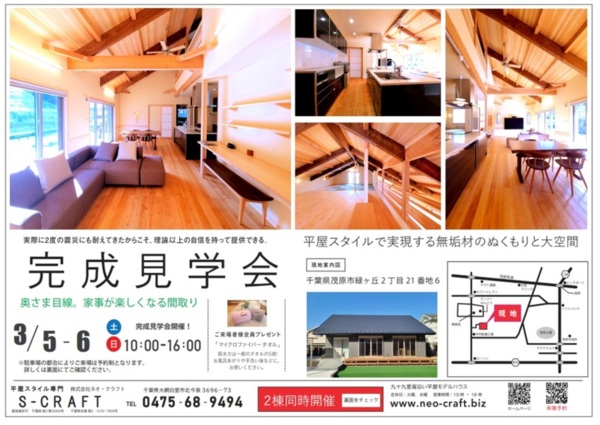 見学会完成見学会 [ 千葉県茂原市 ] 「木の平屋」完成見学会~茂原市~ 2022/3/5-6 平屋スタイルの極め!ロフト34帖で驚きの空間。家事を一番に考えた大解放な平屋スタイル。 開催時間 10時~16時 参加費用 無料 定員 無 開催場所 千葉県 茂原市 緑ヶ丘2丁目21番地6 会場名 茂原完成現場 注意事項 事前予約制となります。 ※ スマートフォンでこのページを開くと、地図アプリでナビゲーションを使用できます。