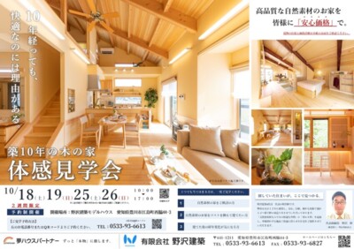 イベントその他のイベント [ 愛知県豊川市江島町 ] 築10年の木の家 体感見学会 2025/10/18(土)19(日)・25(土)26(日) <10年経っても快適なのには理由がある> ・建てた後の経年変化がご覧になれます ・快適な理由を体験できる実験もご用意しております 開催時間 10:00~17:00 参加費用 無料 定員 なし 開催場所 愛知県 豊川市江島町 西脇44-3 会場名 有限会社 野沢建築 ※ スマートフォンでこのページを開くと、地図アプリでナビゲーションを使用できます。