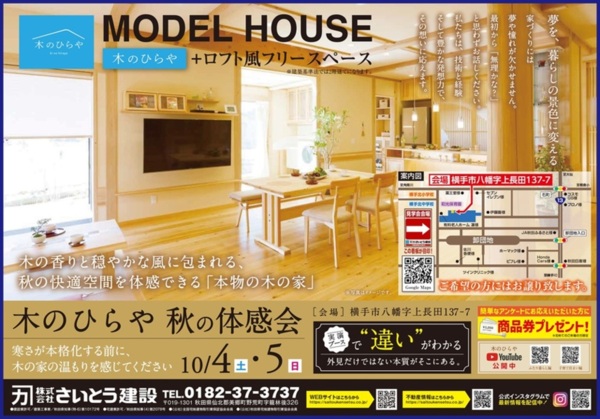 横手市 木のひらやモデルハウスで秋の体感会を開催します。寒さが本格化する前の木の香りと秋の快適空間...