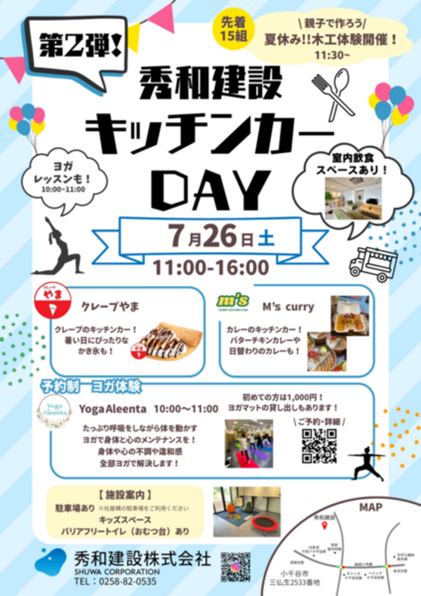 今回は、キッチンカー2店舗ご出店とヨガレッスンが開催...