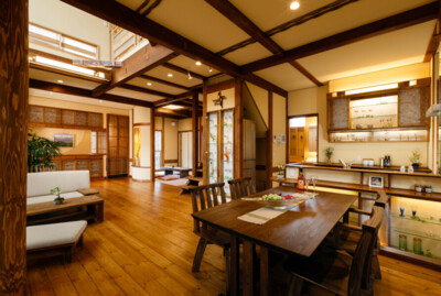 1.古民家調の落ち着いた雰囲気で、ゆったりとくつろげるリビング。
