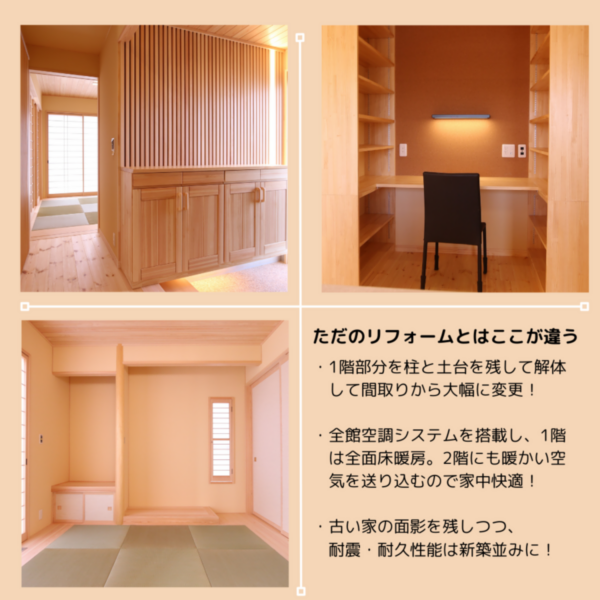 建物を部分的にスケルトン解体で柱と梁の状態にし、耐震補強工事、断熱改修工事を施工し、全館空調「パッシブエアコン」を搭載しています。