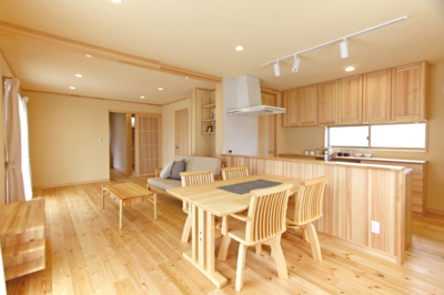 築35年の戸建45坪の2階建て天然木リノベーションモデルハウスです。築30年以上の建物の構造部材は無垢材を利用していることが多いので、その無垢材を再利用して間取りの変更を行い高性能な住まいに造り変える。耐震性、耐久性、省エネ、健康の4つをリセットしバランスのとれた住まいに甦る。